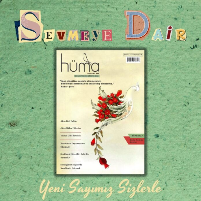 Hüma Dergisi ekibi olarak 28. sayımız ve “SEVMEYE DAİR” dosya konumuzla huzurlarınızdayız. Yüce Yaratıcımız’ın fıtratımıza işlediği, Kendi ahlâkının en değerli vasıflarından olan muhabbetten yaratılana bahşettiği sevgi, bu sayımızın ilk ilhamı oldu. Yaratıcı ile yaratılan arasındaki sevgi bağının en nadide muhatabı, yegâne köprüsü, ümmeti için en güzel örneği, Efendimiz’in (Sallallahu Aleyhi ve Sellem) Rabbine ve ümmetine sevgisi takip etti bu ilhamı. Ümmetinin O’na (Sallallahu Aleyhi ve Sellem) sevgisi, Nâbî’den Süleyman Çelebi’nin Mevlid’ine türlü türlü hatıralarla düşüverdi gönüllerimize. Allah Teâlâ ve Sevgilisi Efendimiz’i (Sallallahu Aleyhi ve Sellem) sevgide de örnek edinen devletin milletine sevgisi Osmanlı Devleti örnekliğiyle, liderin sevgisinin tezahüründe de liderliği Tac Mahal göstergesiyle hatırlandı bu sayımızda. Mümin için müminler ve diğer insanlar ile kâinat sevgisinin anlamı, çeşitli boyutlarıyla incelendi.